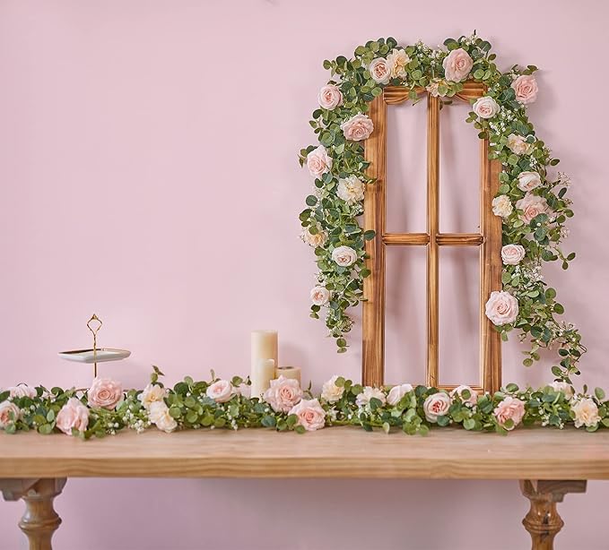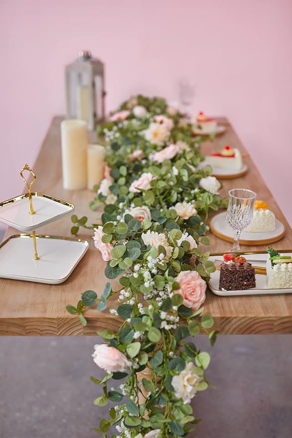 Anna's Whimsy 5.91FT Artificial Eucalyptus Garland with Flowers, Fake Rose Gypsophila Garland, Faux Floral Greenery Garlands for Wedding Spring Party Art Table Runner Decor (Pink, 1)