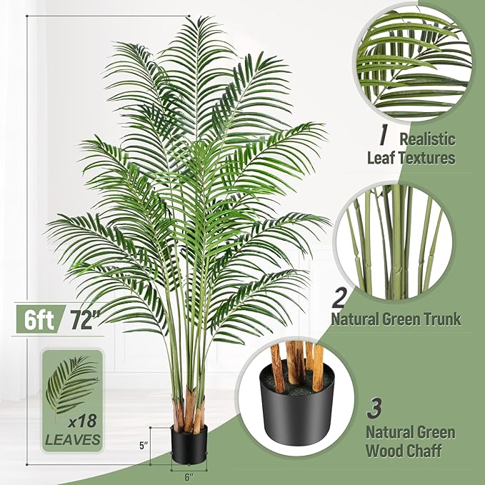 - This 6ft tall artificial palm tree has 18 smooth pristine trunks connected with up to 570 arching feather-like leaves with realistic texture, providing your coastal decor with an authentic and natural look that will last a lifetime,no watering or trimming,looks full and fresh every day