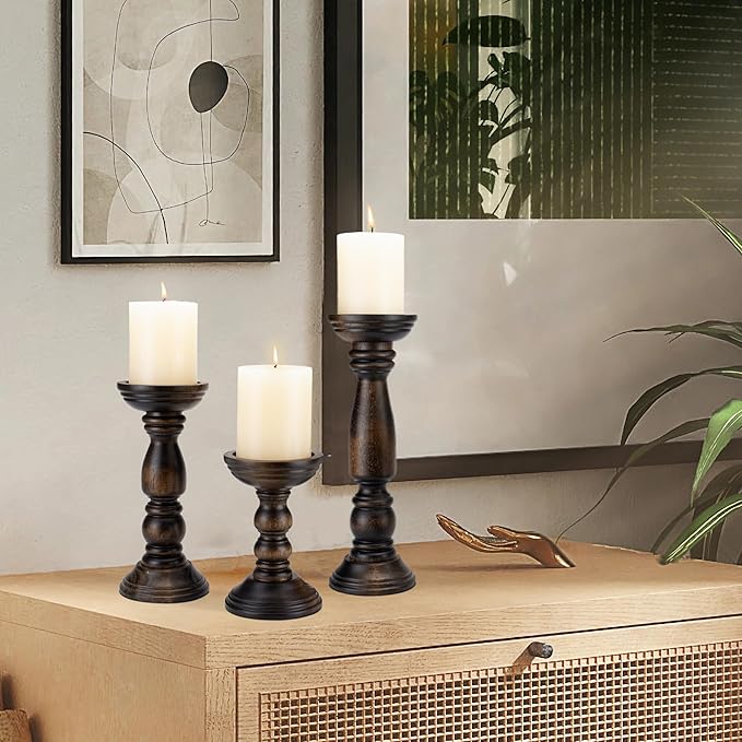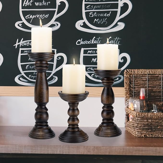 - Dimensions: S:12”×4”M:9”×4” L:6”× 4”. wooden candlesticks are perfectly proportioned, featuring varying heights that create an aesthetically pleasing set. They are perfect wood centerpieces for tables, as well as decorative pieces for fireplace mantel decor, coffee table decor, dining table decor.