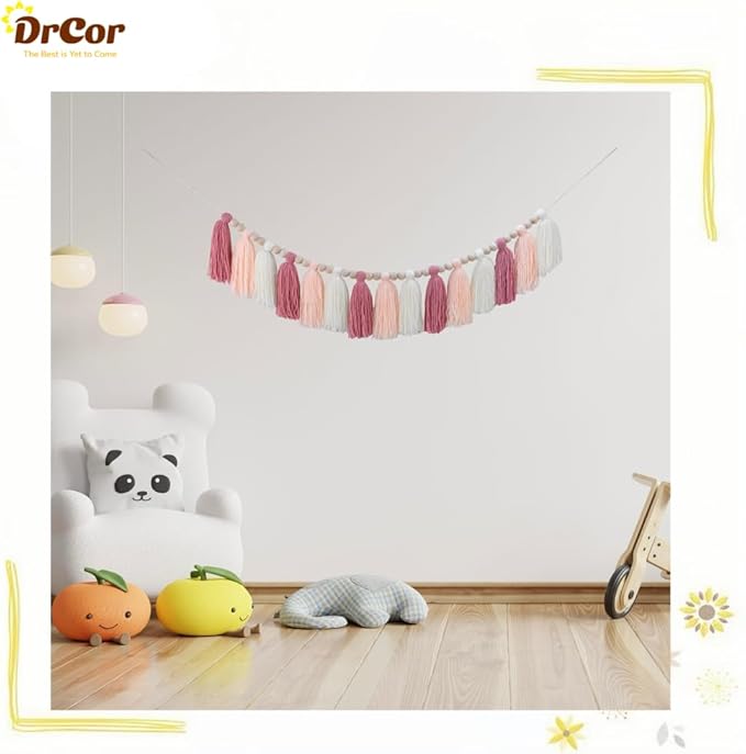 DrCor Pastel Pink Boho Tassel Garland – Blush Nursery Wall Decor for Girls Bedroom, Kids Room or Dorm, Gender Reveal or Baby Shower Backdrop, Bohemian Mantel or Entryway Decoration