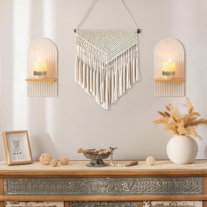 - Boho · Space-Saving · Ambience: Designed for candle sconces decor lovers who appreciate boho, farmhouse, and neutral home aesthetics, this boho wall candle sconces decor is ideal for bathroom, fireplace, and living room walls. It solves the common problem of empty, boring wall space and cluttered countertops by providing a wall-mounted candle sconce solution that enhances visual balance while creating a warm, relaxing, and inviting atmosphere;