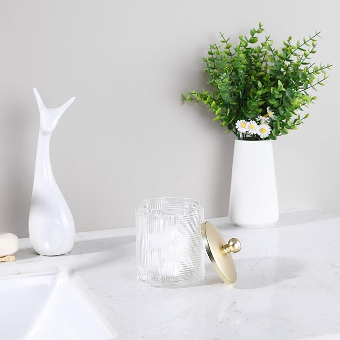 - Premium Glass Construction with Secure Lid: Our jar holder is crafted from high-quality, durable glass that resists scratches and stains. The ribbed design adds a touch of sophistication while the sturdy, metallic-finished lid ensures your items stay dust-free and organized. The ball knob makes it easy to lift the lid, providing convenient access to your essentials. It’s perfect for everyday use in your bathroom, powder room, or even your kitchen.