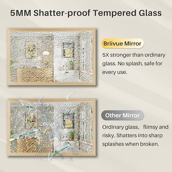 - Shatterproof Tempered Mirror: All BRIIVUE metal rectangler mirror for bathroom is built with tempered glass which is shatter-proof, robustand and more safer to use. Even if broken, it won’t create sharp pieces, protecting your family and pets.
