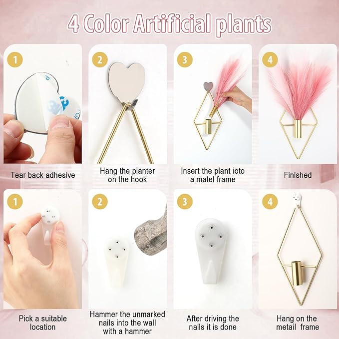 - Complete Home Decor Set: you will receive 4 pieces of metal vase holder wall decor, 8 pieces of artificial pampas bouquet, 4 pieces of non marking hooks and 4 pieces of adhesive heart shaped wall hooks, sufficient quantity for decorations, also sweet to share with others, practical for making your places more warm and cozy