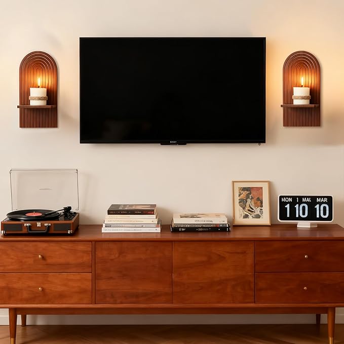 Mid Century Modern Candle Sconces: Set of 2 Walnut Boho Wall Candle Holder Decor for Living Room Fireplace - Arch Candle Shelf for Plants Pillars Candles