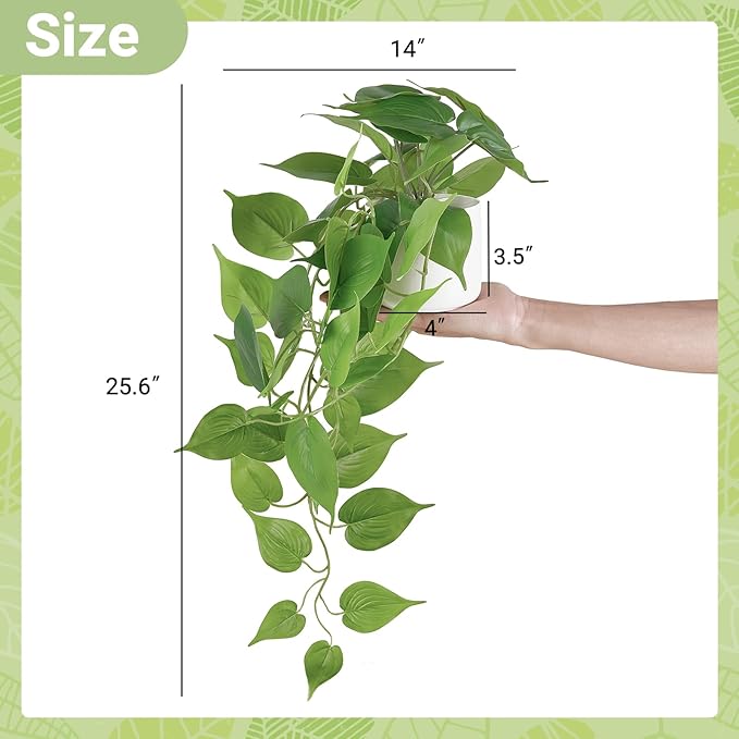 - Demension: The ceramic flower pot has a diameter of 4 inchs and height of 3.5 inches, and the artificial hanging plant is up to 25 inches long. Note: If the leaves fall off, you can stick them back into the stem due to the leaves and stems are detachable