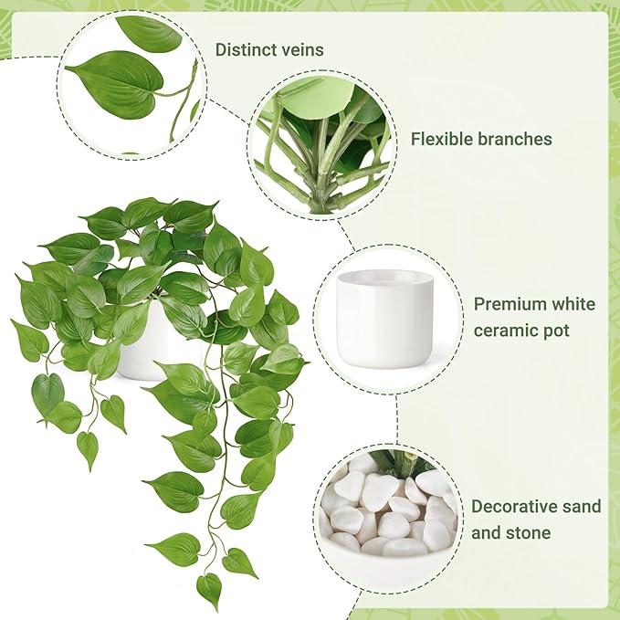 - Versatile Decor: Artificial hanging plants paired with white ceramic pot, perfect for various indoor settings, such as Home, office, hotel, shop, bathroom, bedroom, living room, dining room, entryway, kitchen, windowsills, mantle, table, desk, shelf, furniture tops, and centerpieces