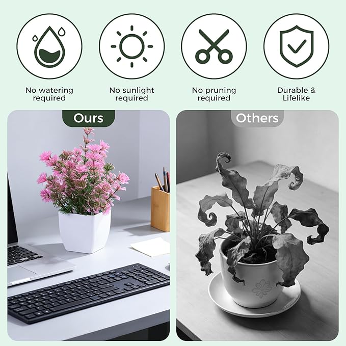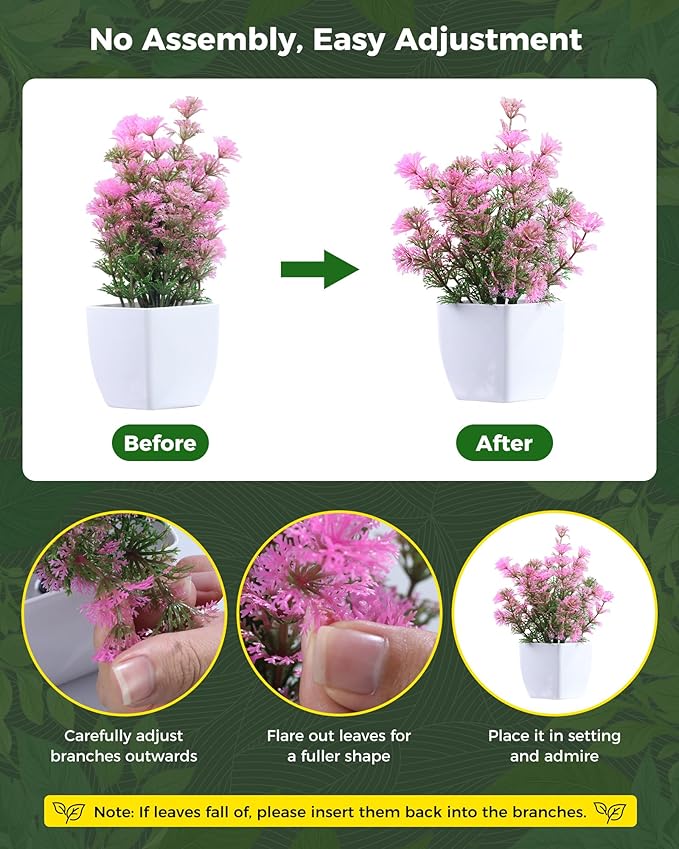 - High-quality materials: Our indoor artificial plants are made of high-quality plastic materials, which are safe, healthy, durable and will not fade. Due to long-term transportation, mini plants may be squeezed and deformed or little smelly. Please ventilate and manually reshape and fiddle with the leaves and stems of artificial plants before use so that they can be restored to the desired shape and appearance after receiving them, so as to achieve the best decorative shape.